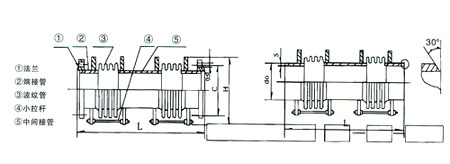 橫向小拉桿波紋補(bǔ)償器由兩段波紋管、中間接管及帶有限螺母的小拉桿等零件組成,它在吸收管系任意平面內(nèi)的橫向位移,同時吸收軸向位移。小拉桿不能承受內(nèi)壓推力!