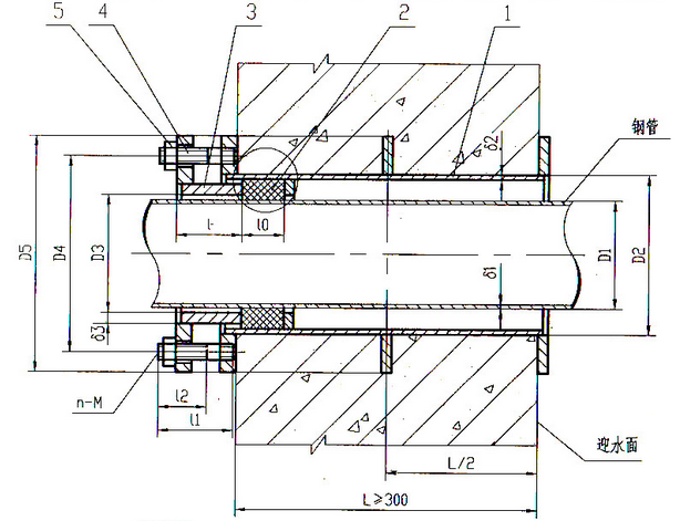 2 、S312型柔性防水套管一般適用于管道穿過墻壁之處受有振動或有嚴(yán)密防水要求的構(gòu)筑物。