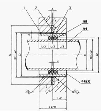 4、套管穿墻處之墻壁,如遇非混凝土墻壁時應改用混凝土墻壁,其澆注混凝土范圍, Ⅱ型套管應比翼環(huán)直徑( D4 )大 200mm ,而且必須將套管一次澆固于墻內(nèi)。套管內(nèi)的填料應緊密搗實。